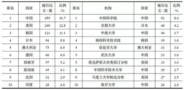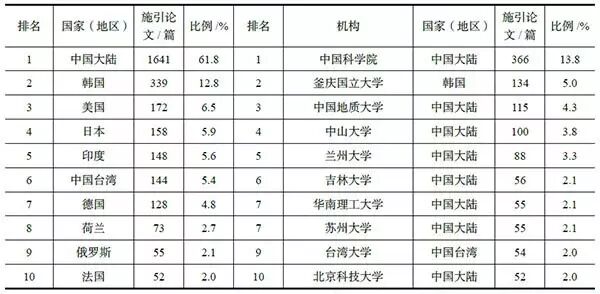 施引论文方面, 中国大陆贡献了1641篇施引论文,以61.8%的比例位于施引论文的第1 梯队。韩国以339篇施引论文位居第2位(表3)。美国、日本、印度、中国台湾和德国贡献的施引论文介于128 ~ 172篇,属于第3梯队。Top 10施引论文机构中,中国大陆和中国台湾的9 家机构入选,Top 10 的另外一家机构是韩国的釜庆国立大学。其中中国大陆的8家机构,中国科学院贡献了366 篇施引论文,位列Top 10 机构的榜首。