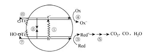 ①光激发电子跃迁;②电子和空穴的复合;③价带空穴氧化吸附物的过程;④导带电子还原表面吸附物;⑤进一步的热反应或光催化反应;⑥半导体表面悬挂空键对导带电子的捕获;⑦半导体表面钛羟基对价带空穴的捕获