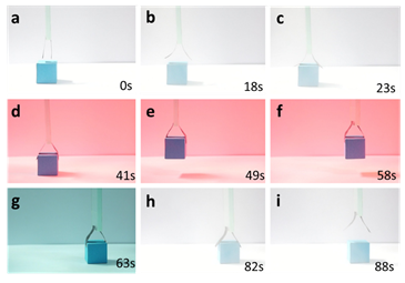 智能夹可夹持移动比自身大的物块:(a)智能夹的初始状态;(b,c)夹子两端张开;(d)夹子抓住物块;(e,f,g)夹子提起并移动物块;(h,i)夹子释放物块。