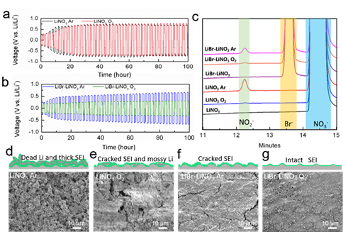 (a, b) 锂对锂电池在不同电解液中循环性能。(c) 锂对锂电池循环后电解液中阴离子浓度。(d-g) 不同金属锂循环后表面SEM表征。