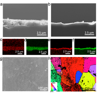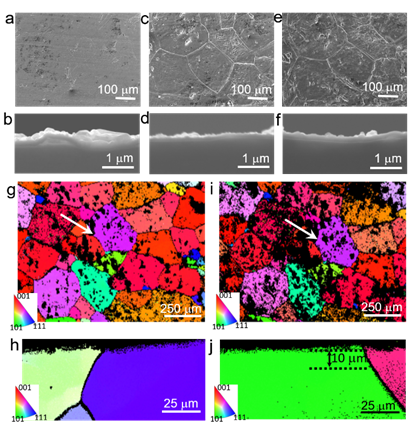 (a,b) 未循环前金属锂表面及截面观察。(c,d,g,h) 金属锂在LiBr-LiNO3放电过后SEM及EBSD表征。(e,f,i,j) 金属锂在LiBr-LiNO3充电过后SEM及EBSD表征