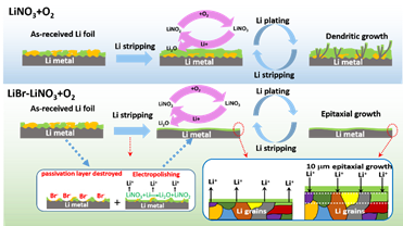 综上所述,在LiBr-LiNO3电解液中,通过Br-和NO3-双阴离子竞争反应,可构建超薄稳定的SEI膜,此SEI膜仅在上述电解液中通过类似电解液抛光的方式得以实现,打破了锂金属理论上不均匀沉积的必然性。此项研究提出了一种实现锂金属外延电沉积的可能性,为构建有效的SEI膜实现抑制锂枝晶生长提供了一种全新的思路。