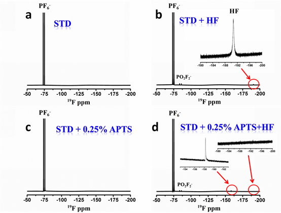 研究人员通过NMR进一步探究了APTS 添加剂与HF酸的相互作用。从d图可以看出,加了添加剂之后,HF酸的特征峰明显消失(与b图相比),表明APTS能够络合消除电解液中的HF酸。