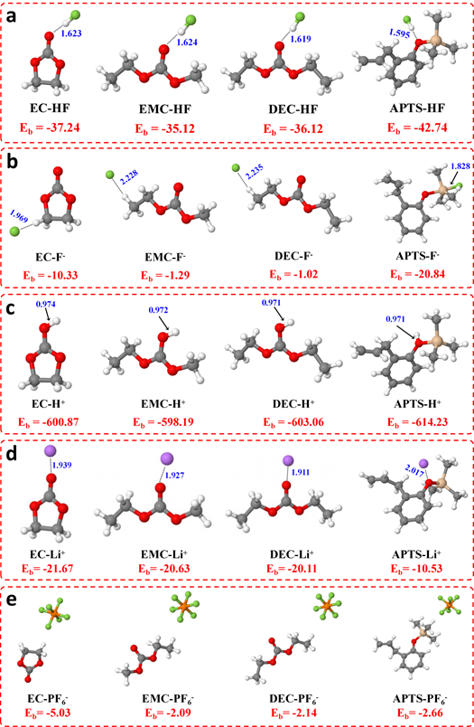 图4:X-HF(a),X- F-(b),X- H+(c),X-Li+(d),X-PF6-(e)的优化结构与结合能(Eb=KJ/mol),X=EC, EMC, DEC 和APTS。