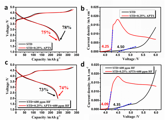 通过首次充放电曲线以及LSV,研究人员探究了不同电解液的氧化行为。可以看出,添加剂在4.25V就开始氧化(图b),而STD电解液则是4.5开始氧化,表明APTS能够优先于碳酸酯溶剂发生氧化反应,形成界面保护膜。加了600 ppm之后,相比于图b,两者电解液的氧化电位均有所提前(图d),表明HF酸促进了电解液的氧化分解。幸运地是,含APTS电解液的氧化电位(4.09 V)依旧比STD(4.35 V)的更小,表明在HF酸的存在,APTS添加剂也能够优先氧化。