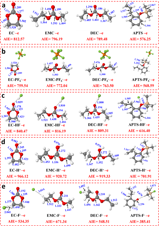 图6:X (a), X-PF6-(b), X-HF (c), X- H+(d),和 X-F-(e), (X = EC, EMC, DEC, APTS)失去一个电子的优化结构以及电离能(AIE, kJ mol−1)。