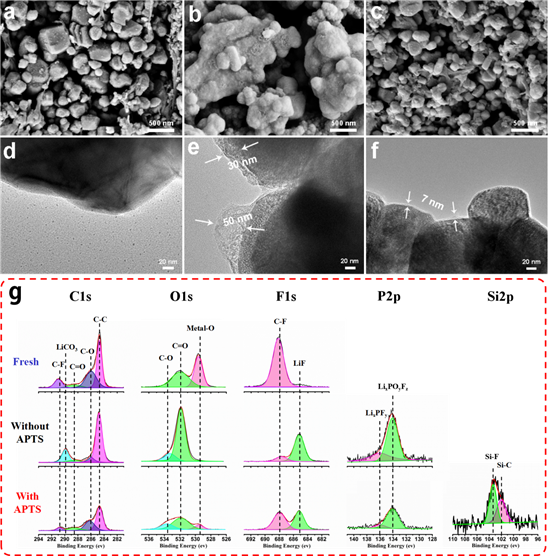 图7:循环前(a, d)与图1循环后正极的SEM、TEM表征,STD中循环后(b,e),含APTS添加剂循环后(c,f);以及XPS(g)表征。