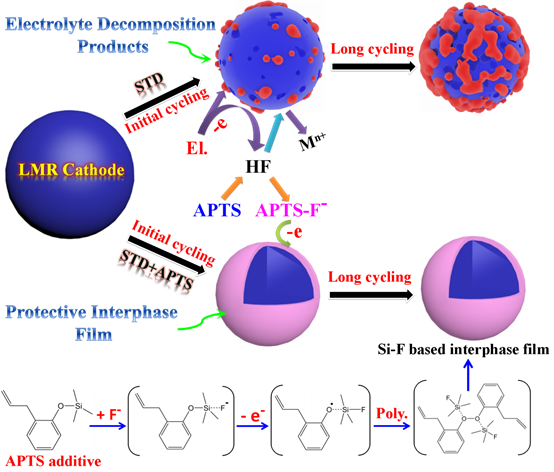 研究人员最后总结了APTS的作用机理图。在STD中,电解液在正极表面发生氧化分解,产生一系列的副产物,产生有害的HF酸,诱导过度金属离子溶解,破坏晶格结构;覆盖在材料表面的聚合物降低了锂离子的传导,增加了电化学阻抗,最终导致电池循环性能的衰减。在电解液加入APTS添加剂之后,添加剂优先与电解液中的HF酸络合,消除有害的HF酸;所产生的的APTS-F- 络合物具有最低的氧化电位,优先在正极材料表面形成一层较薄的界面保护膜,这个成膜过程同时将电解液中的有害F-转移到保护膜中,F-的参与有效增加了界面膜的稳定性。保护膜有效提高了电极/电解液界面的稳定性,有效提高了LMR的循环稳定性。