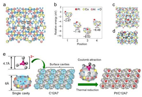 (c,d) Pt单原子在C12A7(001)面最稳定的吸附位点的俯视图和侧视图。