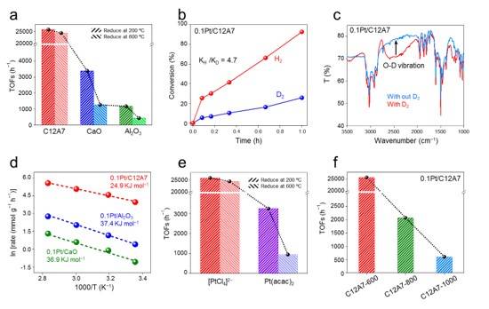 (f) 不同煅烧温度制备的0.1Pt/C12A7的催化活性对比。