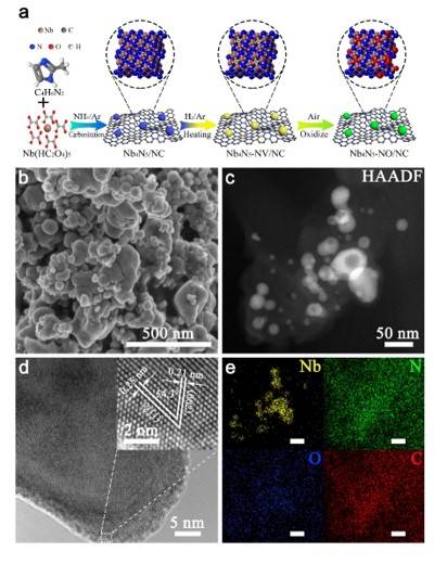 合成的Nb4N5-NO/NC材料显示为不规则的纳米颗粒形貌(图1b)。高角度环形暗场扫描透射电子显微镜(HAADF-STEM)图像(图1c)和能量色散X射线光谱(EDS)元素图谱(图1e)表明,Nb4N5纳米颗粒均匀负载在氮掺杂碳表面。图1d中的高分辨率透射电子显微镜(HRTEM)图像清楚的显示了Nb4N5的(002)晶面和(211)晶面,证明了Nb4N5相的生成。