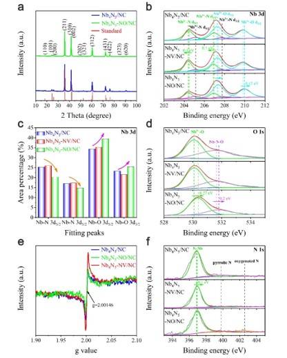图2a为Nb4N5/NC(对照样品,未进行空位构造和氧掺杂)和Nb4N5-NO/NC的XRD图谱,与Nb4N5的标准图谱(JCPDS no. 51-1327)相吻合。图2b,d,f分别通过三种样品(其中,Nb4N5-NV/NC为具有空位但未进行氧掺杂的样品)的Nb 3d,O 1s和N 1s高分辨XPS谱图,跟踪了氧掺杂的形成过程。与Nb4N5/NC相比,Nb4N5-NV/NC中Nb3+-N的结合能向低场偏移(图2b),且 EPR 信号峰(g = 2.00146;图2e)强度增加,这表明了氮空位的形成。与前两个样品相比,Nb4N5-NO/NC中Nb5+-O的结合能(图2b,d)向高场偏移, 且Nb-O键比例增加(图2c),该过程也伴随着EPR信号峰强的显著减弱,这些结果表明氮空位的减少和Nb-O键的同步形成,说明氧成功地被氮空位诱导进了Nb4N5的晶格中。