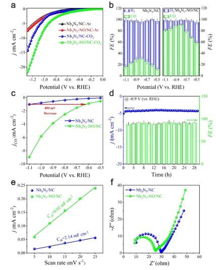 作者进一步测试了该催化剂在0.1 M KHCO3溶液中的电催化CO2RR性能。图3a为在Ar和CO2两种气体饱和下的LSV曲线,Nb4N5-NO/NC展示出了远高于Nb4N5/NC的电流密度。图3b显示,Nb4N5-NO/NC在-0.8 V(vs. RHE)电势下达到91%的法拉第效率(FE)。分电流密度(jco;图3c)显示在同样的jco=-1.0 mA cm-2处, Nb4N5-NO/NC的过电势相比于Nb4N5/NC降低了490 mV。此外,Nb4N5-NO/NC具有良好的稳定性,其催化性能(电流密度和法拉第效率)可以保持30 h不衰减(图3d)。双电层电容(Cdl)评价结果(图3e)显示,Nb4N5-NO/NC具有较高的电化学比表面积;电化学阻抗谱(EIS;图3f)表明了其较高的电子传导性,这些优良特性共同促进了Nb4N5-NO/NC的CO2RR性能。