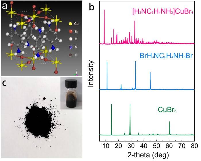 图一. (a) pPDACuBr4晶体结构;(b)反应物与生成物粉末XRD衍射图谱;(c) pPDACuBr4研磨粉末及配置溶液的照片
