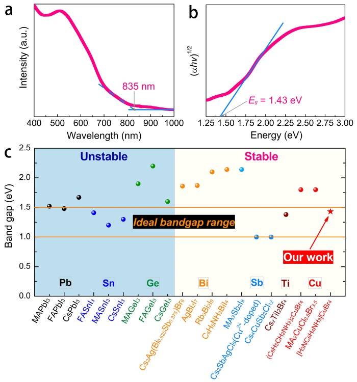 图二. (a) pPDACuBr4薄膜紫外可见吸收光谱; (b) pPDACuBr4带隙值推算;(c)常见钙钛矿结构带隙值与稳定性统计