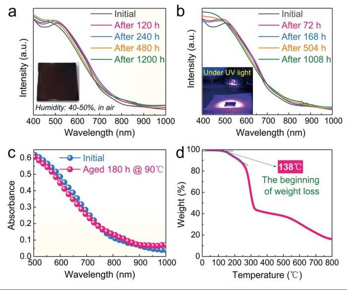 3.pPDACuBr4粉末和薄膜在大气、加热、紫外灯光照等条件下均展现出了优异的稳定性,从而证实了这种新合成的材料兼具合适带隙和高稳定性的特点。