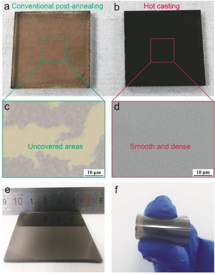 图四. (a-d)普通旋涂与热旋涂工艺制备pPDACuBr4薄膜的宏观、微观形貌对比;热旋涂法在(e)大面积(4.5 cm×4.5 cm)导电玻璃基底和(f)柔性基底上制备薄膜的照片