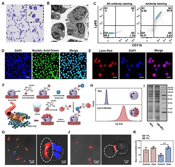 图1.NEs和UM-NEs的制备和表征。(A)Wright Giemsa染色观察NEs形态;(B)透射电镜观察NEs的形态;(C)流式细胞术分析NEs纯度;(D)DAPI和 绿色核酸染料标记NEs;(E)Lyso tracker Red和DAPI染料标记NEs;(F)UM-NEs的合成路线。(G)UM-Cy5修饰后细胞成像;(H)流式细胞术检测UM-Cy5;(I) 细胞蛋白质组的银染分析;(J)观察气泡推进UM-NEs。(K)CO2和NH3生成。