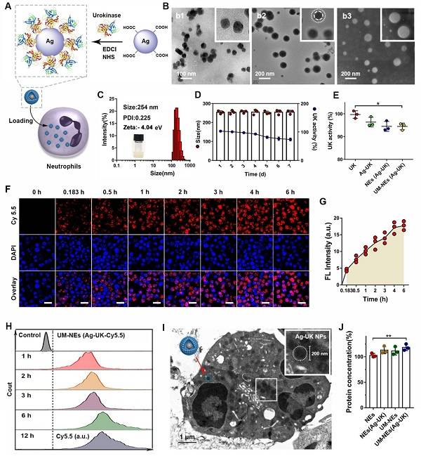 图2.UM-NEs(Ag-UK)体系的制备和表征。(A)Ag-UK纳米颗粒的合成方法;(B)b1:羧酸银纳米颗粒的TEM图;b2:Ag-UK纳米颗粒的TEM图像;b3:Ag-UK纳米颗粒的SEM图像;(C)Ag-UK纳米颗粒的动态光散射数据和zeta数据;(D) Ag-UK纳米颗粒稳定性及酶活性;(E)不同组别酶活对比;(F-G)Ag-UK-Cy5的UM-NEs摄取;(H)流式细胞术检测UM-NEs(Ag-UK-Cy5.5);(I)用透射电镜观察了UM-NEs(Ag-UK)体系的形貌;(J)不同组的蛋白质浓度。