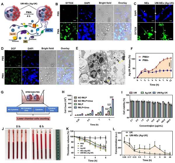 图3.UM-NEs(Ag-UK)的功能测试。(A)UM-NEs(Ag-UK)药物释放示意图;(B,C)UM-NEs(Ag-UK)中性粒细胞形变能力评估;(D)ROS生成;(E)TEM观察UM-NEs(Ag-UK)细胞形变与释药;(F)Ag-UK释放效率;(G)使用Transwell系统评估UM-NEs(Ag-UK)的炎症靶向能力示意图;(H)不同组别的细胞迁移计数;(J-K)UM-NEs(Ag-UK)体外溶栓效果;(L)48小时内的药代动力学研究。