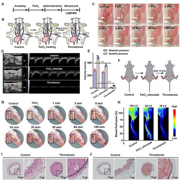 图4.动脉血栓模型构建。(A-B) 颈动脉血栓模型构建示意图;(C)观察小鼠颈动脉血栓形成过程。(D-E)超声分析颈动脉血流灌注情况;(F)下肢动脉血栓模型构建示意图;(G)观察小鼠下肢动脉血栓形成过程;(H)激光散斑血流监测系统(LSBFMS)分析下肢动脉血流;(I-J)血栓模型和对照组血管的H-E和Masson染色图。