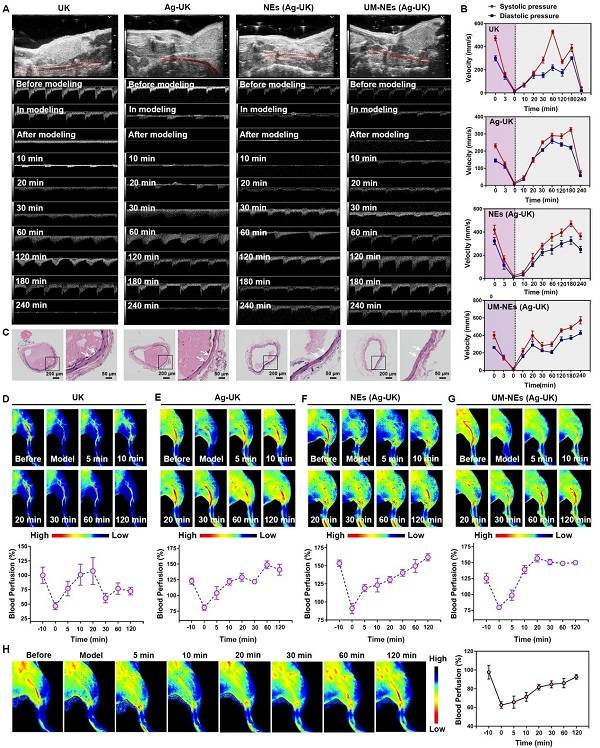 图6.UM-NEs(Ag-UK)体内溶栓效果研究。(A-B)使用多普勒超声评估溶栓治疗的血流情况;(C)颈动脉血栓部位H-E染色分析;(D-H)激光散斑血流监测系统分析小鼠溶栓治疗的血液灌注情况。