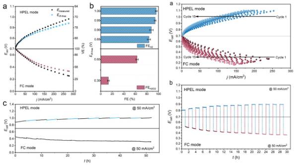 亮点3:该一体式过氧化氢循环电池(UR-HPCC)可以实现在H2O2电解模式(HPEL 模式)下高效产氢(FEH2>90%), 在燃料电池模式(FC模式)下合成过氧化氢(FEH2O2> 60%); 并且在两种工作模式下的总过电位小于10 mV,能量循环效率(RTE)超过90%。