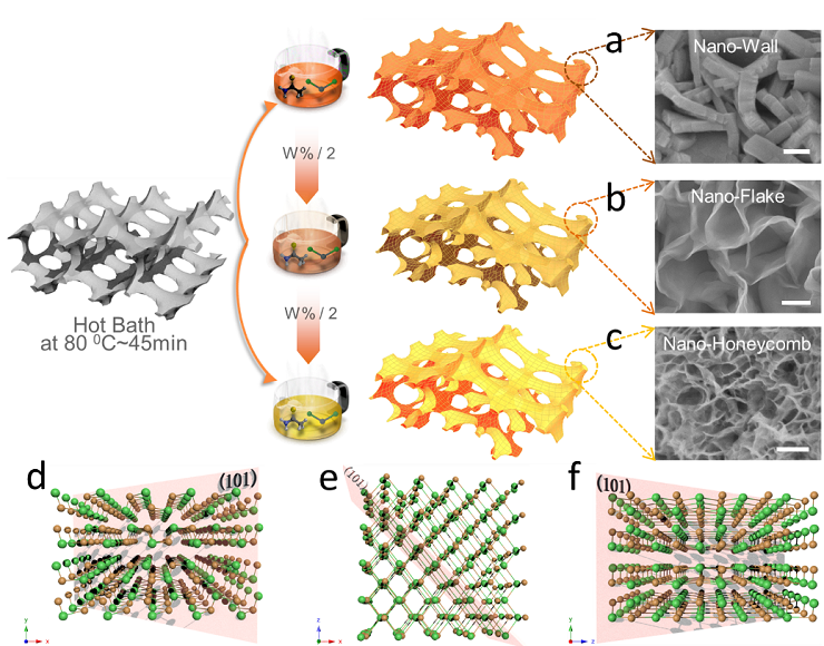 (a-c)分别为Nano-Wall, Nano-Flake, Nano-Honeycomb结构层状SnS,均生长于轻质柔性导电的三维石墨烯基底上,三种纳米片分别400-500, 400-500, 50-70 nm宽及约150, 10, 5 nm 厚;(d-f)为SnS的结构示意图。