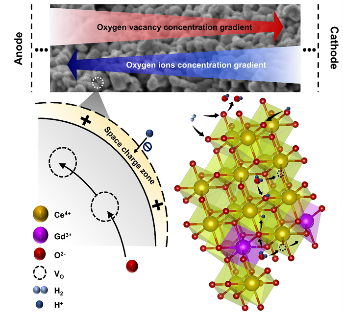 传统的氧离子萤石电解质和的质子钙钛矿电解质以及相应的陶瓷燃料电池(SOFC/PCFC)依赖于其阳离子掺杂形成的结构缺陷(氧空位),受结构限制其离子电导率不能满足600℃以下应用的需求。为此,我们在氧离子导体结构构建质子在颗粒表面的快速迁移网络/通道,通过燃料电池原位操作条件下的电化学质子注入,使钆掺杂的氧化铈实现了低温下高的质子传导,并提出了质子和氧离子协同输运机制。为低温 SOFC/PCFC 的发展提供了新的视角和科学机制。