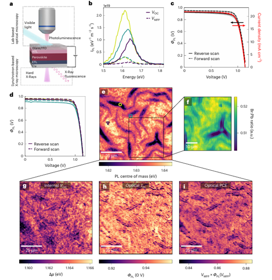 近日,剑桥大学Miguel Anaya & Samuel D. Stranks团队在 Nature Energy 期刊发表了题为“The impact of interfacial quality and nanoscale performance disorder on the stability of alloyed perovskite solar cells”的论文。作者开发了一种多模态原位显微镜工具包,用于测量和空间相关纳米尺度的电荷传输损失、复合损失和化学组成;应用电压依赖性光致发光(PL)显微镜,结合同步加速器X射线纳米探针荧光(nXRF)技术绘制钙钛矿吸收层的光电特性和化学成分。